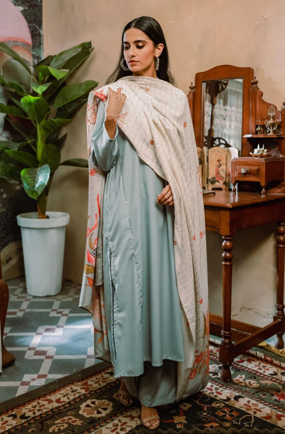 Gulnaar (Fruit Flora) Odhni - Sage Grey