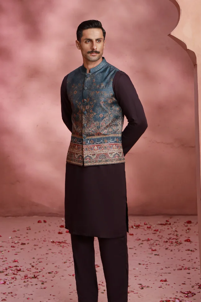 Men's Grey Jahangir Vasket, made from Premium Raw Silk, features beautiful Urdu words throughout.